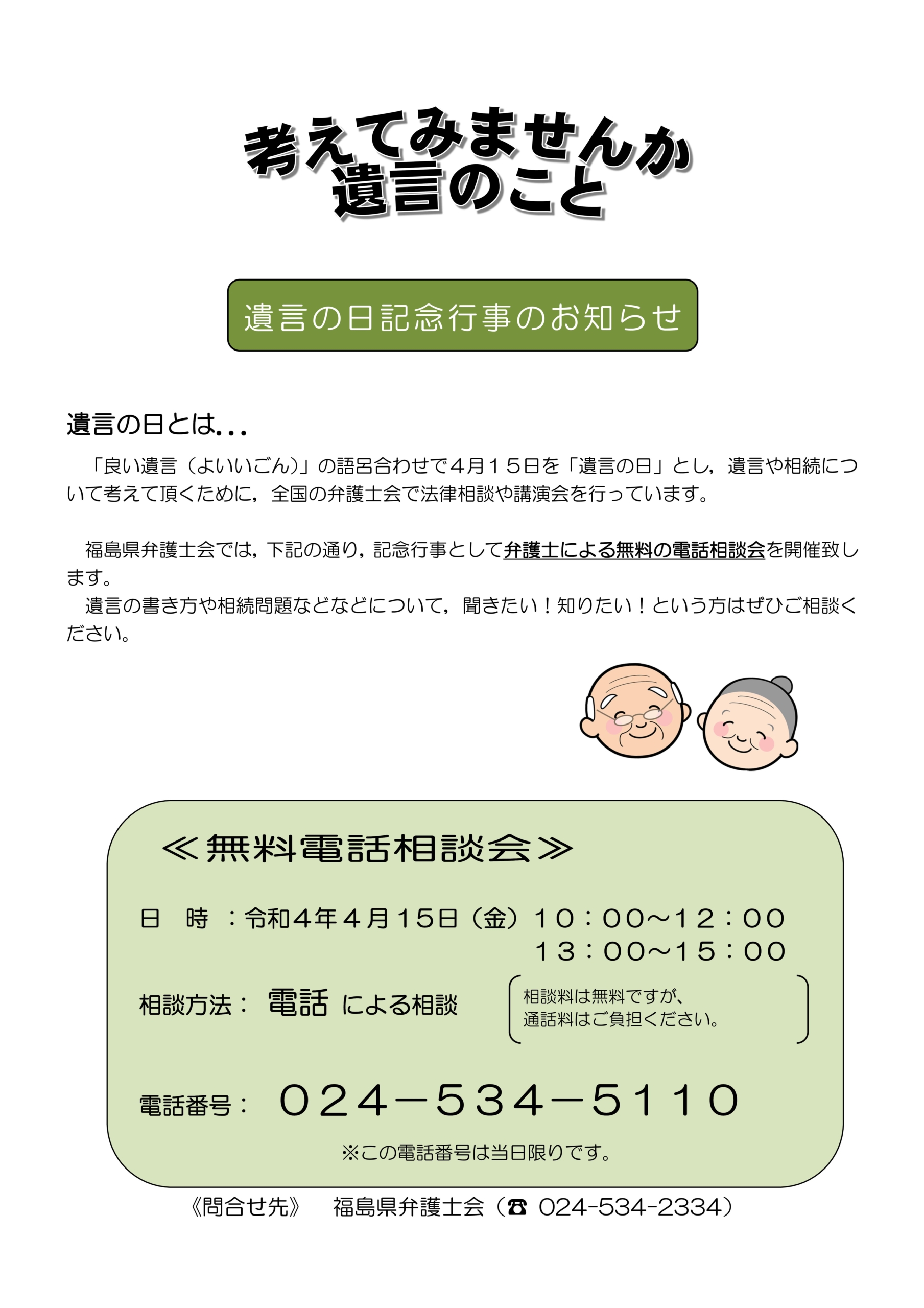 Topics ホーム > Topics > 相談会・イベント情報 > 2022.4.15(金)10:00~遺言の日記念行事 無料電話相談会※終了しました 2022.4.15(金)10:00~遺言の日記念行事 無料電話相談会※終了しました 2022/04/06 終了しました カテゴリー 会長声明 等(244) 人権救済申立事件『警告・勧告・要望』(34) 相談会・イベント情報(162) その他(25) 最近の投稿 被収容者の郵送戸籍等請求を信書通数制限に含めないことを求める要望 2025.11.26(水) 全国一斉生活保護ホットライン ※終了しました 2025.11.13(木)第7回全国一斉障害年金法律相談会 ※終了しました 2025.11.1(土)14:00~17:00 シンポジウム「女性法律家に会ってみよう!~弁護士・裁判官・検察官という仕事~」 ※終了しました 佐賀県警察科学捜査研究所の職員によるDNA型鑑定に係る不正行為を非難し 、原因の究明と徹底した再発防止策の実施を求める会長声明 月別投稿一覧 月を選択 2025年10月 (2) 2025年9月 (1) 2025年8月 (1) 2025年7月 (2) 2025年6月 (3) 2025年4月 (1) 2025年3月 (1) 2025年2月 (1) 2024年12月 (1) 2024年11月 (1) 2024年10月 (1) 2024年9月 (2) 2024年8月 (2) 2024年6月 (4) 2024年5月 (3) 2024年4月 (1) 2024年2月 (1) 2024年1月 (1) 2023年11月 (3) 2023年10月 (3) 2023年8月 (2) 2023年6月 (4) 2023年5月 (1) 2023年3月 (1) 2023年2月 (1) 2022年12月 (3) 2022年11月 (1) 2022年10月 (2) 2022年9月 (1) 2022年8月 (2) 2022年7月 (2) 2022年6月 (3) 2022年5月 (4) 2022年4月 (2) 2022年3月 (1) 2021年12月 (1) 2021年11月 (5) 2021年10月 (1) 2021年9月 (2) 2021年8月 (2) 2021年6月 (7) 2021年5月 (1) 2021年3月 (2) 2021年2月 (5) 2021年1月 (1) 2020年11月 (2) 2020年10月 (6) 2020年8月 (1) 2020年7月 (1) 2020年6月 (3) 2020年5月 (2) 2020年4月 (2) 2020年3月 (2) 2020年2月 (2) 2020年1月 (2) 2019年12月 (1) 2019年11月 (2) 2019年10月 (5) 2019年9月 (3) 2019年8月 (2) 2019年6月 (3) 2019年5月 (2) 2019年4月 (2) 2019年3月 (4) 2019年2月 (2) 2019年1月 (2) 2018年11月 (2) 2018年10月 (2) 2018年9月 (1) 2018年8月 (3) 2018年7月 (2) 2018年6月 (3) 2018年5月 (2) 2018年4月 (1) 2018年2月 (4) 2017年12月 (1) 2015年10月 (1) 2014年3月 (1)