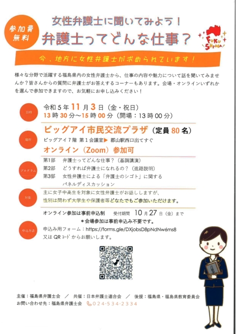 Topics ホーム > Topics > 相談会・イベント情報 > 2023.11.3(金・祝日) 13:30~15:00 シンポジウム「女性弁護士に聞いてみよう!弁護士ってどんな仕事?」 ※終了しました 2023.11.3(金・祝日) 13:30~15:00 シンポジウム「女性弁護士に聞いてみよう!弁護士ってどんな仕事?」 ※終了しました 2023/10/05 ※終了しました カテゴリー 会長声明 等(244) 人権救済申立事件『警告・勧告・要望』(34) 相談会・イベント情報(162) その他(25) 最近の投稿 被収容者の郵送戸籍等請求を信書通数制限に含めないことを求める要望 2025.11.26(水) 全国一斉生活保護ホットライン ※終了しました 2025.11.13(木)第7回全国一斉障害年金法律相談会 ※終了しました 2025.11.1(土)14:00~17:00 シンポジウム「女性法律家に会ってみよう!~弁護士・裁判官・検察官という仕事~」 ※終了しました 佐賀県警察科学捜査研究所の職員によるDNA型鑑定に係る不正行為を非難し 、原因の究明と徹底した再発防止策の実施を求める会長声明 月別投稿一覧 月を選択 2025年10月 (2) 2025年9月 (1) 2025年8月 (1) 2025年7月 (2) 2025年6月 (3) 2025年4月 (1) 2025年3月 (1) 2025年2月 (1) 2024年12月 (1) 2024年11月 (1) 2024年10月 (1) 2024年9月 (2) 2024年8月 (2) 2024年6月 (4) 2024年5月 (3) 2024年4月 (1) 2024年2月 (1) 2024年1月 (1) 2023年11月 (3) 2023年10月 (3) 2023年8月 (2) 2023年6月 (4) 2023年5月 (1) 2023年3月 (1) 2023年2月 (1) 2022年12月 (3) 2022年11月 (1) 2022年10月 (2) 2022年9月 (1) 2022年8月 (2) 2022年7月 (2) 2022年6月 (3) 2022年5月 (4) 2022年4月 (2) 2022年3月 (1) 2021年12月 (1) 2021年11月 (5) 2021年10月 (1) 2021年9月 (2) 2021年8月 (2) 2021年6月 (7) 2021年5月 (1) 2021年3月 (2) 2021年2月 (5) 2021年1月 (1) 2020年11月 (2) 2020年10月 (6) 2020年8月 (1) 2020年7月 (1) 2020年6月 (3) 2020年5月 (2) 2020年4月 (2) 2020年3月 (2) 2020年2月 (2) 2020年1月 (2) 2019年12月 (1) 2019年11月 (2) 2019年10月 (5) 2019年9月 (3) 2019年8月 (2) 2019年6月 (3) 2019年5月 (2) 2019年4月 (2) 2019年3月 (4) 2019年2月 (2) 2019年1月 (2) 2018年11月 (2) 2018年10月 (2) 2018年9月 (1) 2018年8月 (3) 2018年7月 (2) 2018年6月 (3) 2018年5月 (2) 2018年4月 (1) 2018年2月 (4) 2017年12月 (1) 2015年10月 (1) 2014年3月 (1)